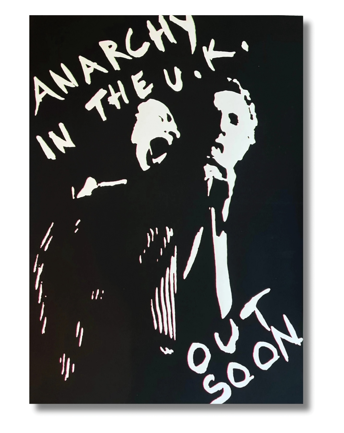 A reproduction of Reid’s promotional poster issued in anticipation of the Sex Pistols’ debut single, Anarchy in the UK, released on 26 November 1976