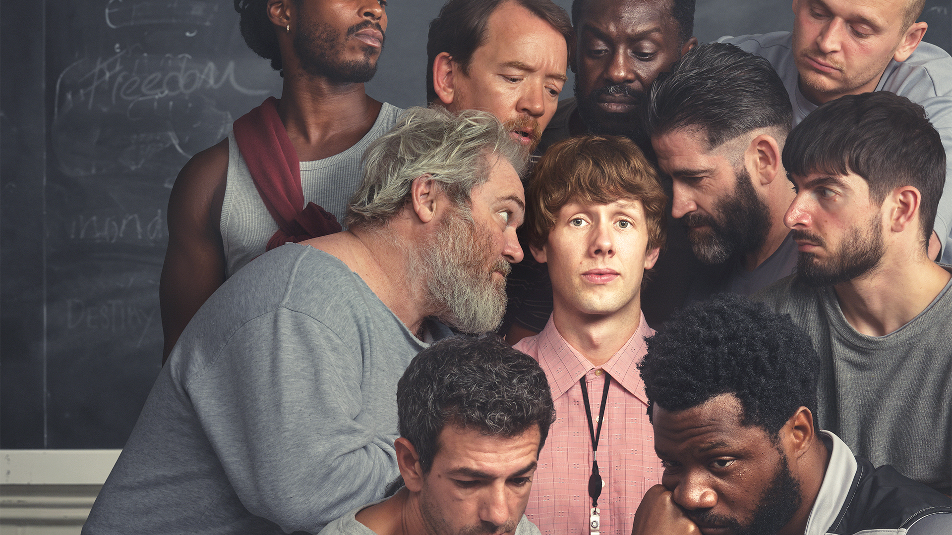 Dan (Josh Finan, centre) surrounded by the prisoners he teaches philosophy to in Waiting for the Out. Image: BBC Studios / Sister Pictures / Sane Seven