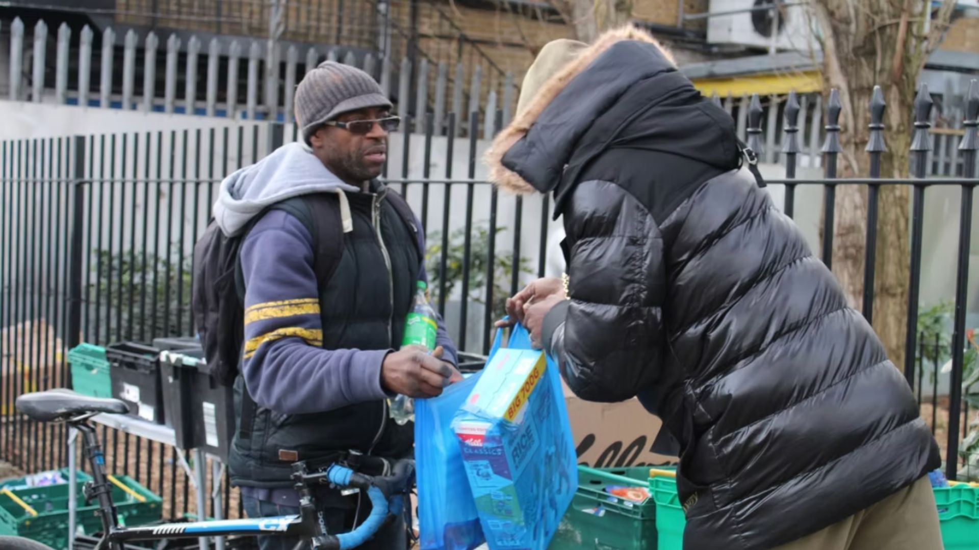 When Big Issue visits – after an afternoon spent interviewing City of London bankers – set-up is in full swing. Crates line the square: fresh fruit and veg; canned goods, sausages, sandwiches, bottles of water, stir-fry kits. Volunteers buzz around, chatting with attendees and catching up.